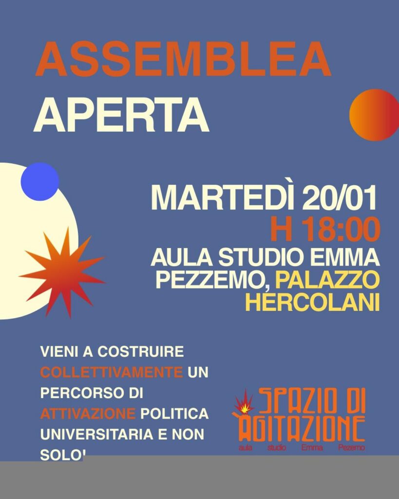 Nasce un nuovo presidio in università: Spazio di Agitazione, a Palazzo Hercolani, nell’aula studio intitolata a Emma Pezemo, studentessa vittima di femminicidio nel 2021, per costruire un nuovo luogo di confronto e discussione per la comunità universitaria, e per attivarsi di fronte a un governo sempre più aggressivo.